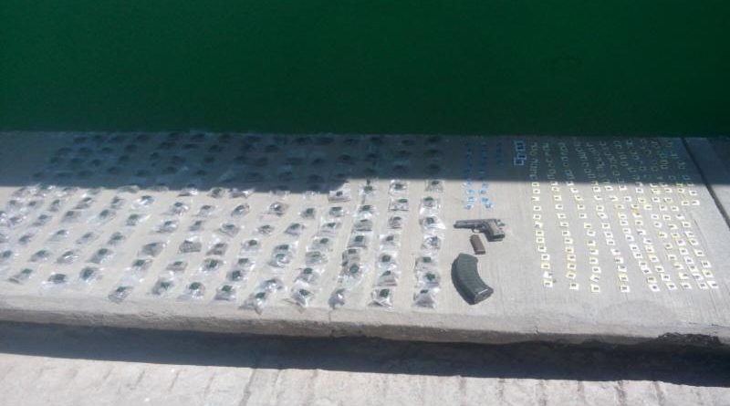 Zacatecas, Zac.- Elementos de la Policía Estatal Preventiva (PEP) aseguraron 378 dosis de estupefacientes, un arma de fuego corta y una camioneta. En los hechos, ocurridos en Ojocaliente, también detuvieron a dos hombres.