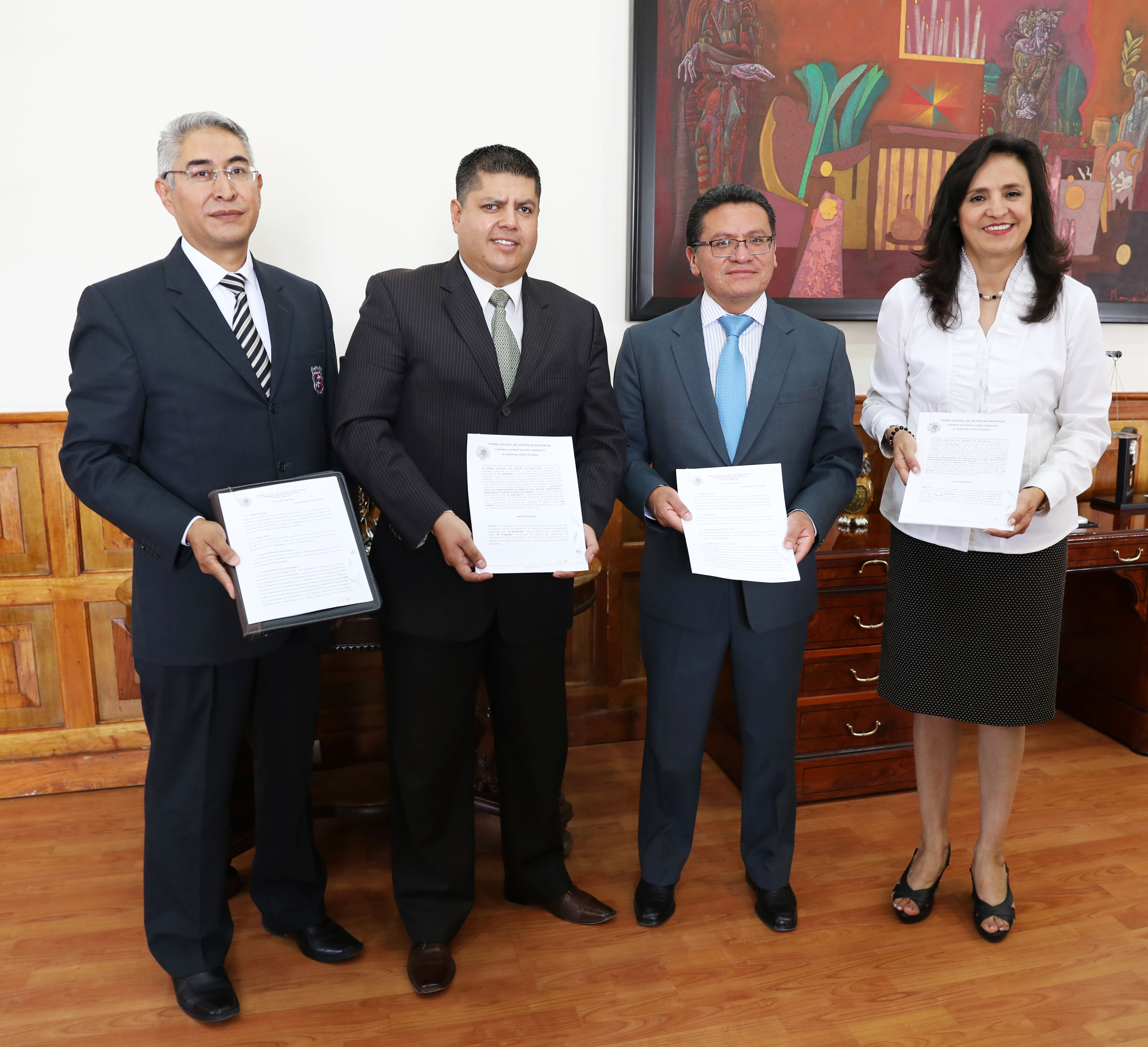 Acompañado de la Licenciada María Concepción Irene García Almeida, Oficial Mayor del Tribunal Superior de Justicia, Juan Antonio del Hoyo Ávila, Secretario Seccional del Sutsemop en el Poder Judicial del Estado, el Magistrado Presidente Armando Ávalos Arellano y el Secretario General del SUTSEMOP, Miguel Ángel Toribio Bañuelos, firmaron el convenio de prestaciones en el cual se otorga un 6 por ciento en el concepto 01 que se refiere a sueldo, y concepto 02 a la compensación.
