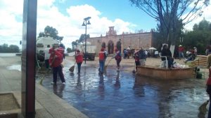 Este domingo, un equipo de trabajo integrado por personal de Barrido Manual y tres camionetas, respaldadas por tres pipas de agua de la Secretaría de Infraestructura del gobierno del estado, se dieron la tarea de comenzar la limpieza desde las inmediaciones de la estación del tren, donde se reunieron los jinetes, hasta la explanada del cerro.