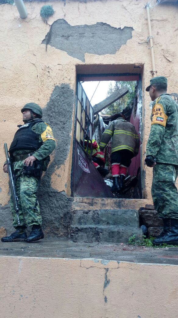 En la calle Segunda de los Bolos 12A, se trabajó en coordinación con el Ejército Mexicano ante el colapso del techo, informó Moisés Cortés Solís, encargado de la corporación de rescate.