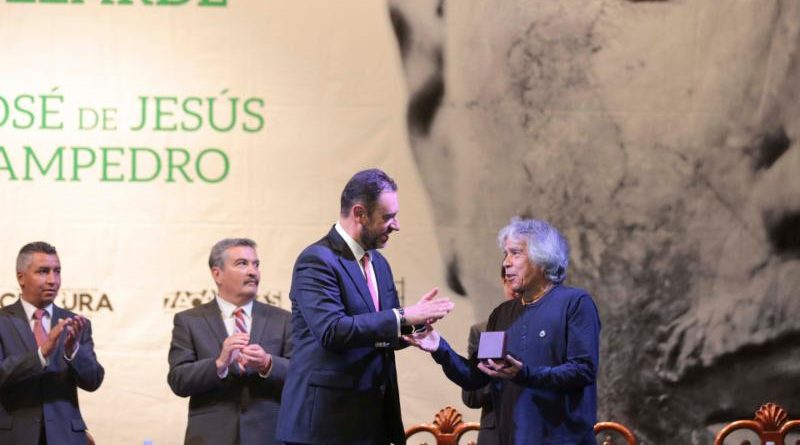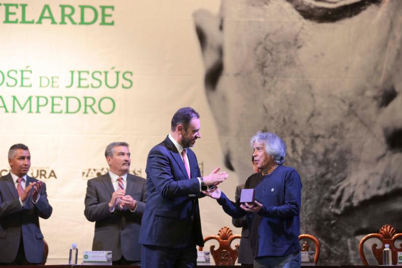 Jerez, Zac.- Por la alta calidad de su obra literaria y su fervor por la poesía lopezvelardeana, el poeta y ensayista José de Jesús Sampedro recibió del Gobernador Alejandro Tello el Premio Iberoamericano Ramón López Velarde 2018.