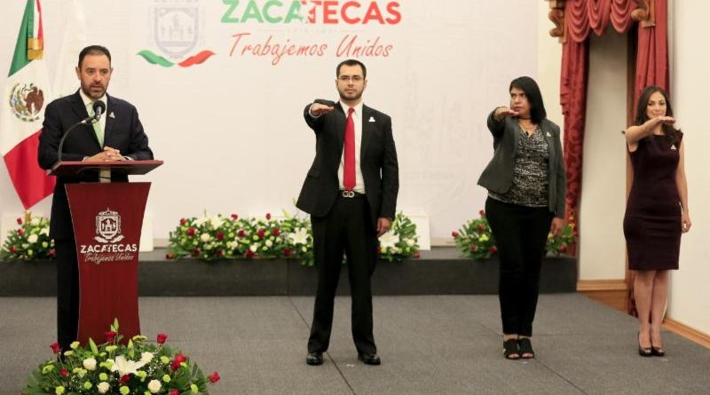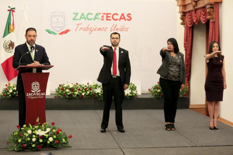 Zacatecas, Zac.- El Gobernador Alejandro Tello tomó protesta a cuatro nuevos funcionarios y funcionarias, a quienes consideró como “caras nuevas”, con experiencia profesional y méritos propios en las áreas para las que fueron designados.