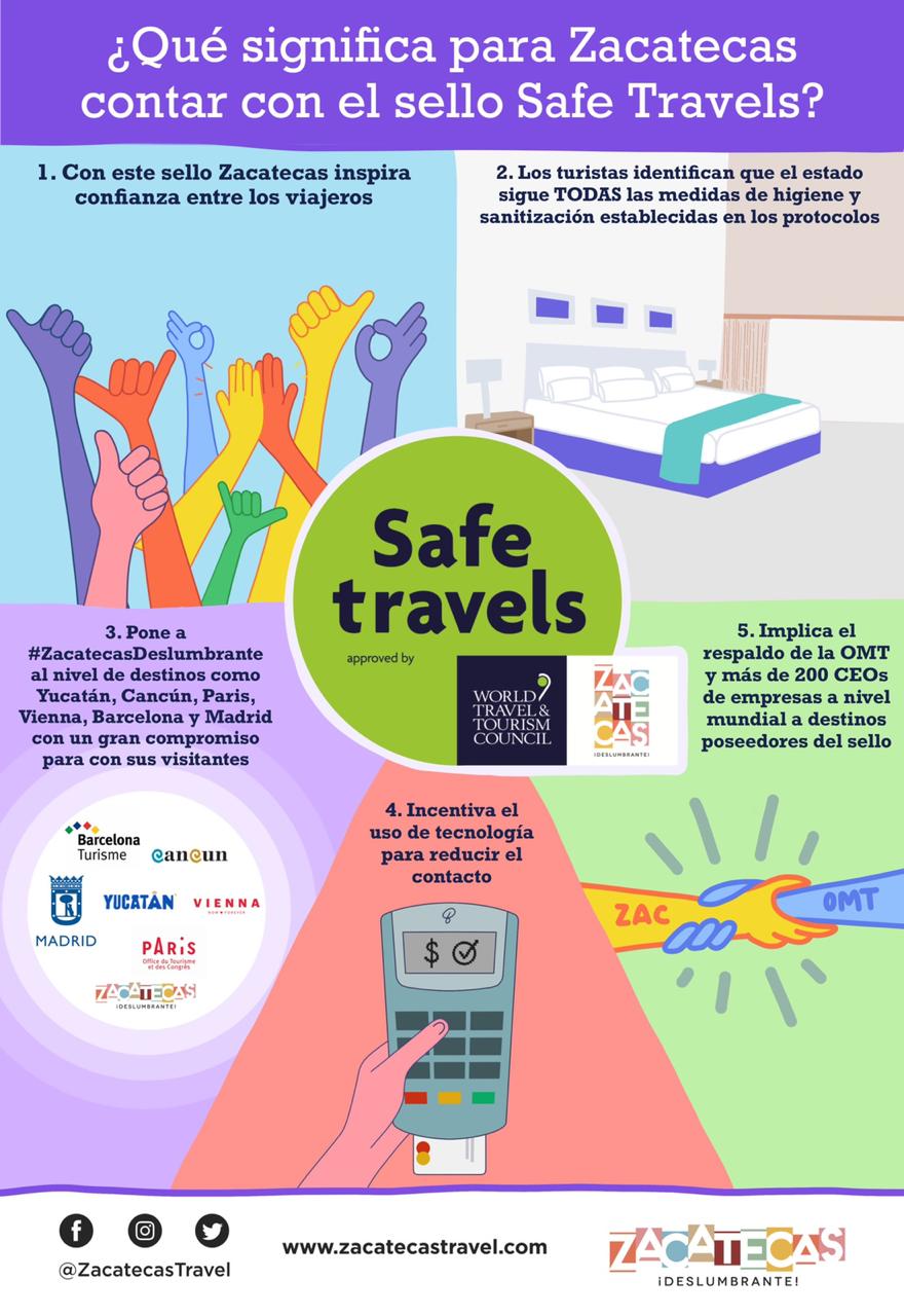 Zacatecas, Zac.-Zacatecas Deslumbrante recibió el sello internacional de Viaje Seguro (Safe Travels), otorgado por el Consejo Mundial de Viajes y Turismo (WTTC), distintivo que permite ofrecer estándares de salud e higiene para dar seguridad durante la estancia de turistas y visitantes en un destino.