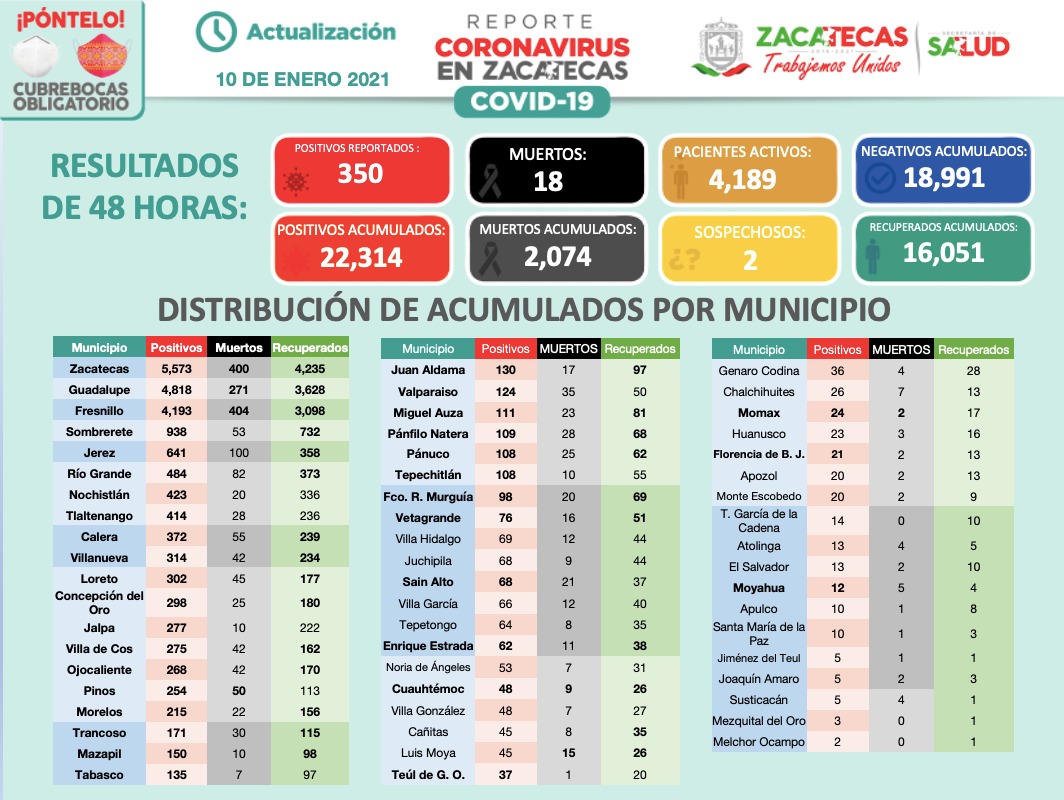Zacatecas, Zac., 10 de enero de 2021.- Zacatecas acumula 22 mil 314 casos positivos de Coronavirus (COVID-19); en las últimas 48 horas la Secretaría de Salud estatal reportó 350 nuevos casos confirmados, informó el titular del área, Gilberto Breña Cantú. Los municipios que concentran el mayor número de ellos son Zacatecas, Guadalupe, Fresnillo, Sombrerete, Tlaltenango y Jerez.