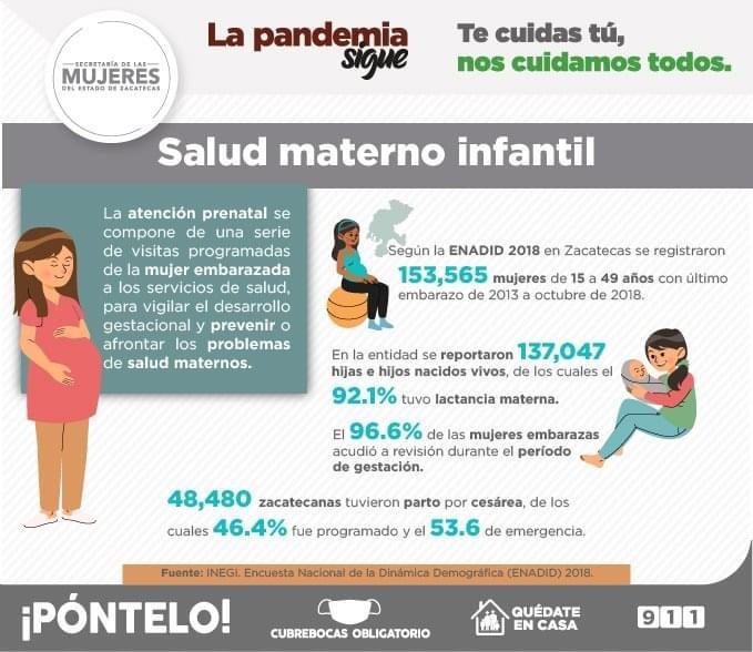 Zacatecas, Zac.- La Secretaría de las Mujeres estatal (Semujer) invita a las madres zacatecanas a acercarse a la dependencia y las autoridades correspondientes a conocer sobre la importancia de la salud materna, a fin de atenderlas en todos los aspectos, desde el embarazo hasta el posparto, y así evitar complicaciones.