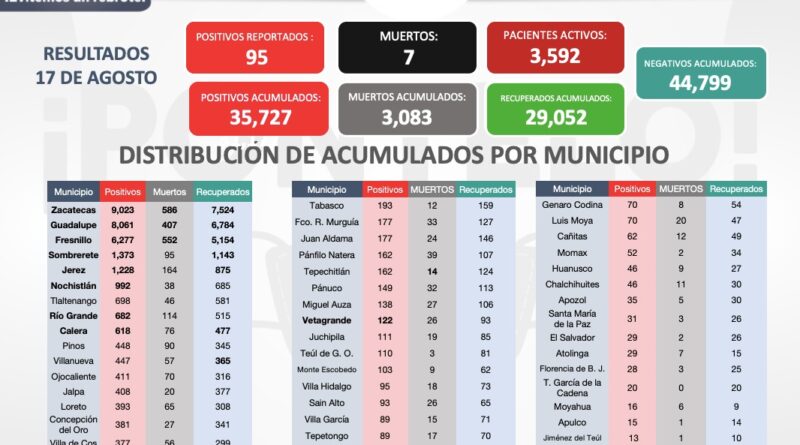Zacatecas, Zac., 17 de agosto de 2021.- En las últimas 24 horas, la Secretaría de Salud de Zacatecas (SSZ) reportó la muerte de siete zacatecanos por complicaciones de COVID-19, además, 95 nuevos casos y 50 personas recuperadas.