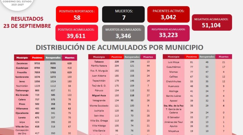 Zacatecas, Zac., 23 de septiembre de 2021.- La Secretaría de Salud de Zacatecas (SSZ) reportó este día que 58 zacatecanos más se contagiaron de COVID-19; el virus también causó la muerte de siete personas y 77 más dejaron atrás la enfermedad que éste provoca.