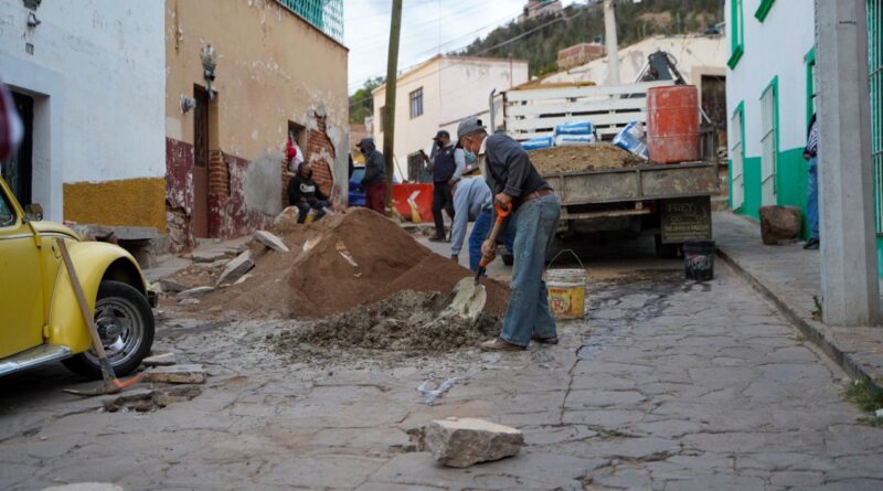 Ahí, el alcalde Jorge Miranda Castro, acompañado del secretario de Servicios Públicos, Miguel Ángel Félix, evaluó el trabajo de bacheo en la calle Del Ángel, donde comenzaron a instalar adoquín irregular con mortero de fraguado rápido.