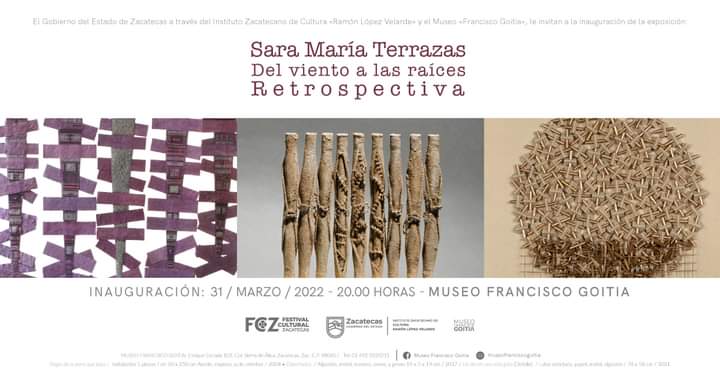 Zacatecas, Zac., 31 de marzo de 2022.- Con la exposición “Del viento a las raíces. Retrospectiva”, de la artista zacatecana Sara María Terrazas, inicia hoy la apertura al público de las exposiciones del Festival Cultural Zacatecas 2022.