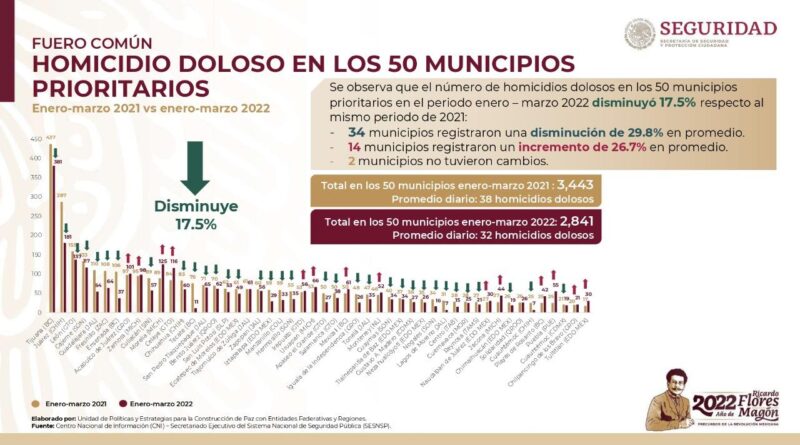 Se reportó que la cifra de homicidios dolosos en los 50 municipios prioritarios disminuyó en el primer trimestre de 2022, comparado con similar periodo de 2021; entre estas demarcaciones se encuentra Fresnillo, que en 2021 registró 108 homicidios, y en 2022, 64, por lo que también es palpable la disminución en la comisión de este delito.