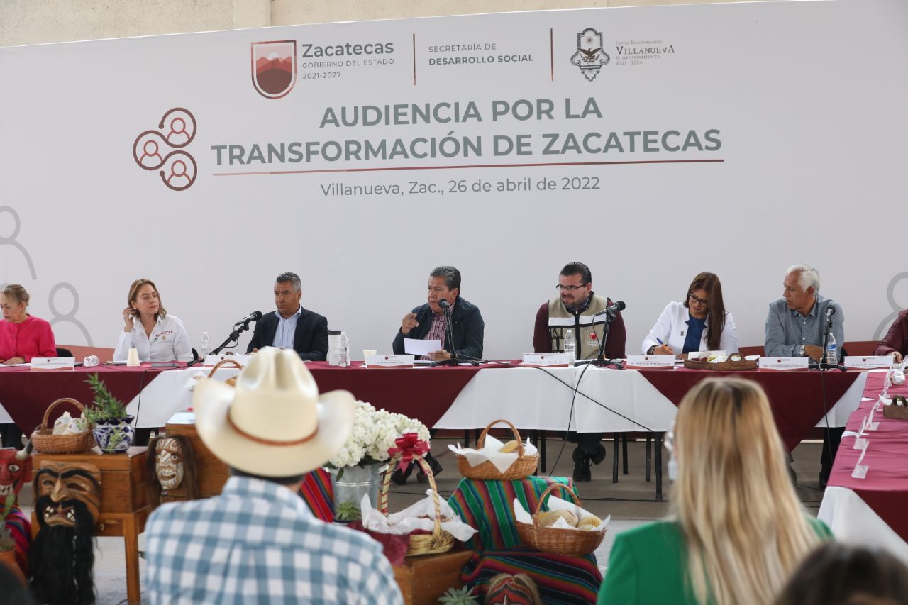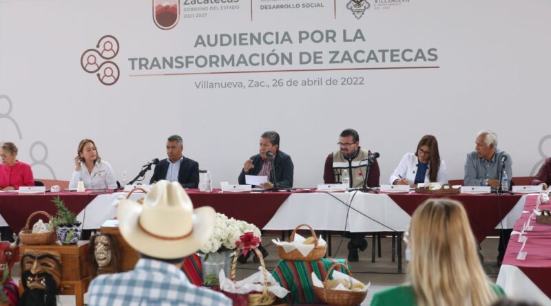 Villanueva, Zac., 26 de abril de 2022.- Para atender de manera personal las demandas de las y los ciudadanos, el Gobernador David Monreal Ávila llevó a Villanueva la Audiencia por la Transformación de Zacatecas, en donde los villanovenses le solicitaron diversos apoyos a los cuales el mandatario les dio respuestas y soluciones inmediatas.