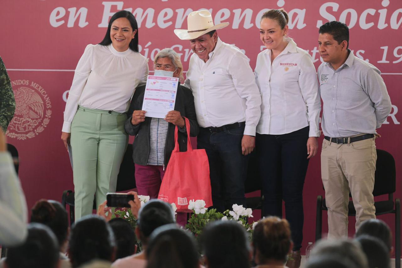 Este jueves, en gira de trabajo, el mandatario estatal y la encargada de la política social del país, acompañados por la Delegada de Programas para el Desarrollo, Verónica Díaz Robles, el Secretario de Desarrollo Social del estado, Carlos Zúñiga y el Coronel de Infantería, Fidencio Márquez Reyes, en representación de la Secretaría de la Defensa Nacional (Sedena), distribuyeron casi 11 millones de pesos en apoyos de 10 mil pesos para cada una de las familias beneficiarias.