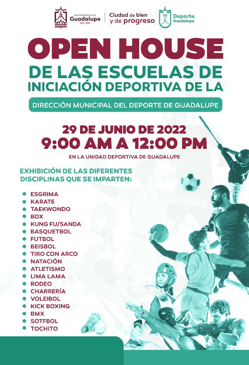 El Ayuntamiento de Guadalupe, que preside Julio César Chávez Padilla, a través de la Dirección Municipal del Deporte, convoca al público en general a participar en el ‘Open House’ de las escuelas de iniciación deportiva del municipio, cuyo objetivo es promover la instrucción de diferentes disciplinas deportivas en niños y adolescentes, multiplicando la práctica físico-deportiva organizada.