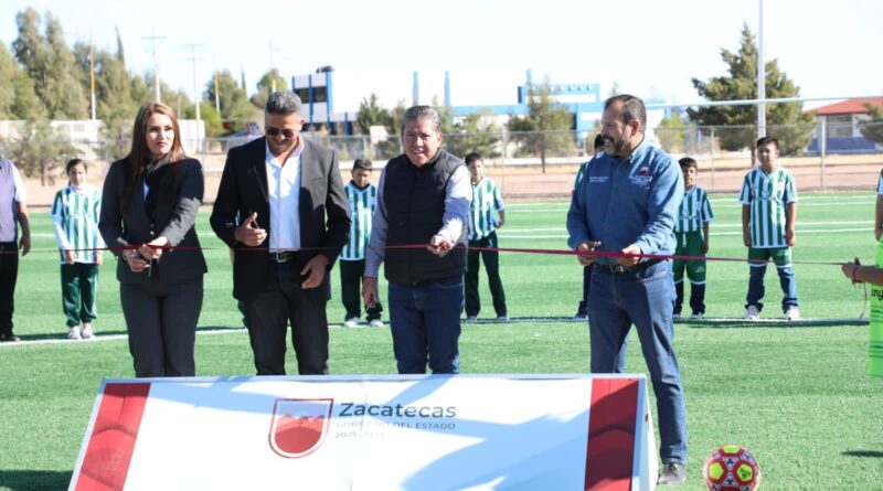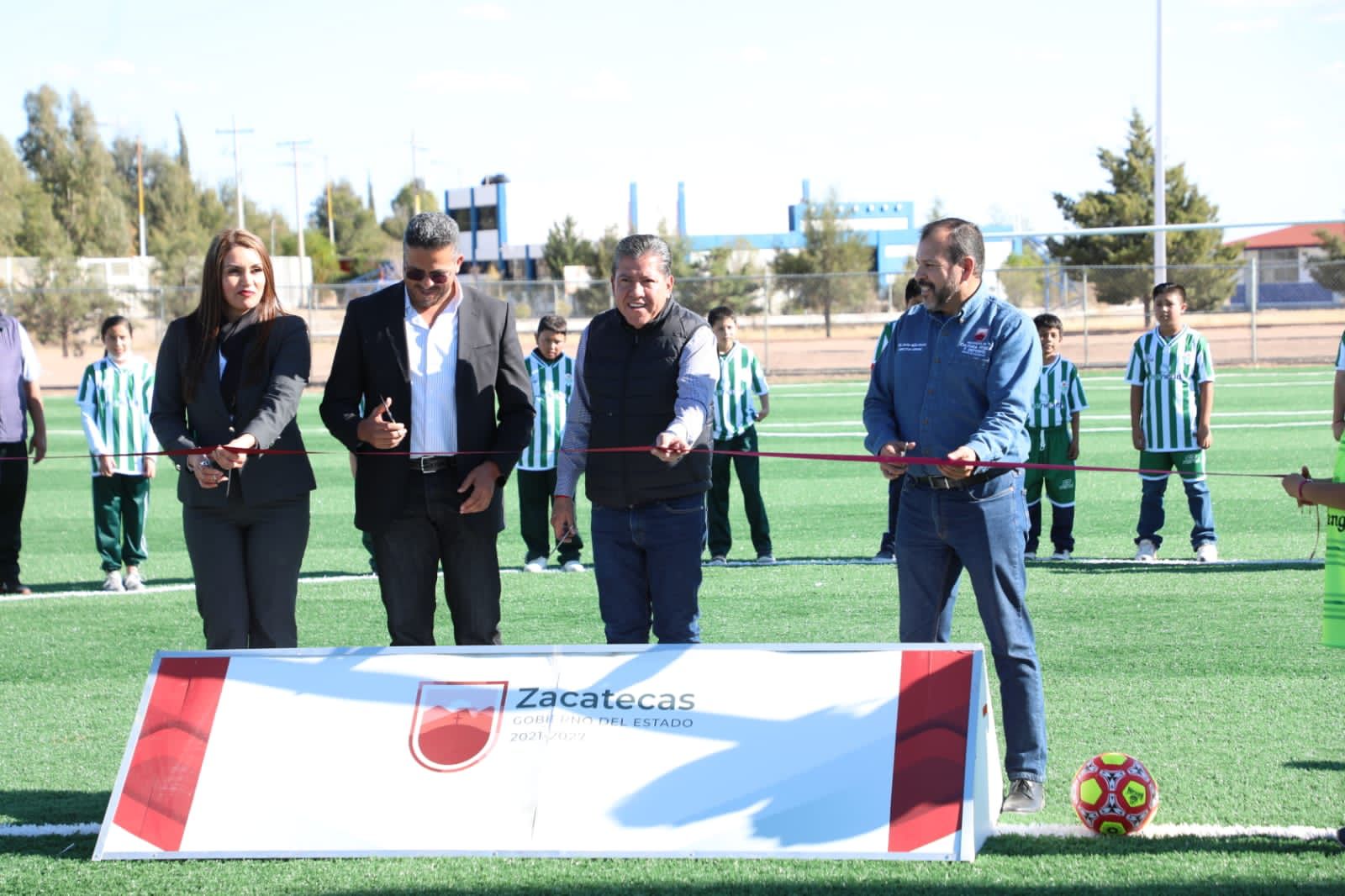 Al terminar la supervisión de esta obra, el Gobernador David Monreal se dirigió a la Unidad Deportiva de Nieves, donde entregó la obra de modernización de la cancha de pasto sintético, que ayudará a la práctica del futbol a niñas, niños, jóvenes y adultos, en su apuesta por la promoción del deporte, la sana competencia, la recreación y la convivencia familiar.