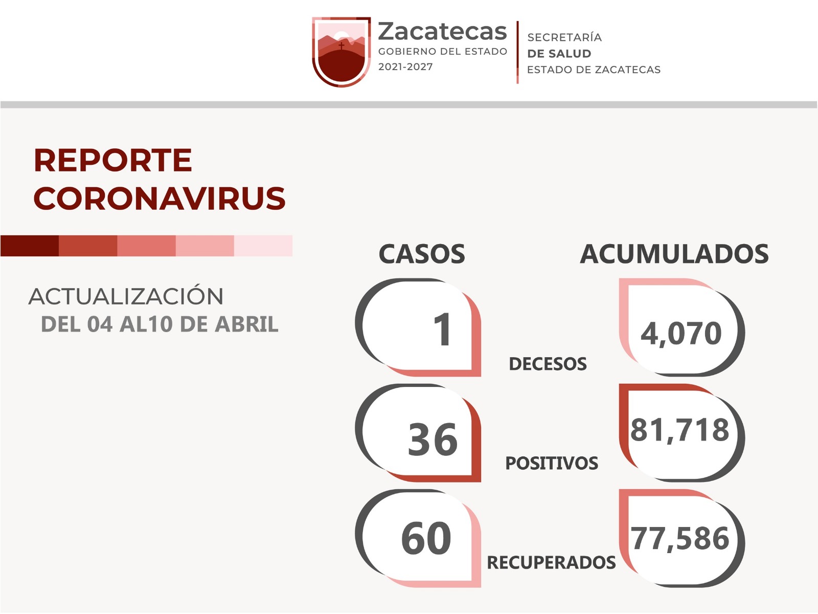 Zacatecas, Zac., 10 de abril de 2023.- La Secretaría de Salud de Zacatecas (SSZ) informó que, en la semana del 4 al 10 de abril, contabilizaron 60 pacientes recuperados de COVID-19, a 36 nuevos casos positivos y un fallecimiento atribuido al coronavirus, en todo el territorio estatal.