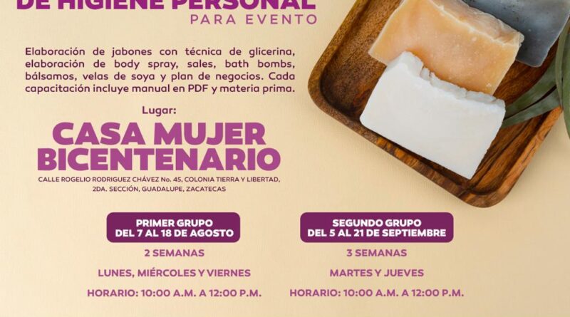 Con el objetivo de fomentar las actividades que permitan desarrollar una oportunidad de autoempleo y generar un ingreso económico para las mujeres guadalupenses, el Ayuntamiento de Guadalupe que encabeza el Presidente Municipal José Saldívar Alcalde, a través de la Dirección de la Mujer Guadalupense, invita a la población en general a formar parte del Curso-Taller de Jabonería y Regalos de Higiene Personal.