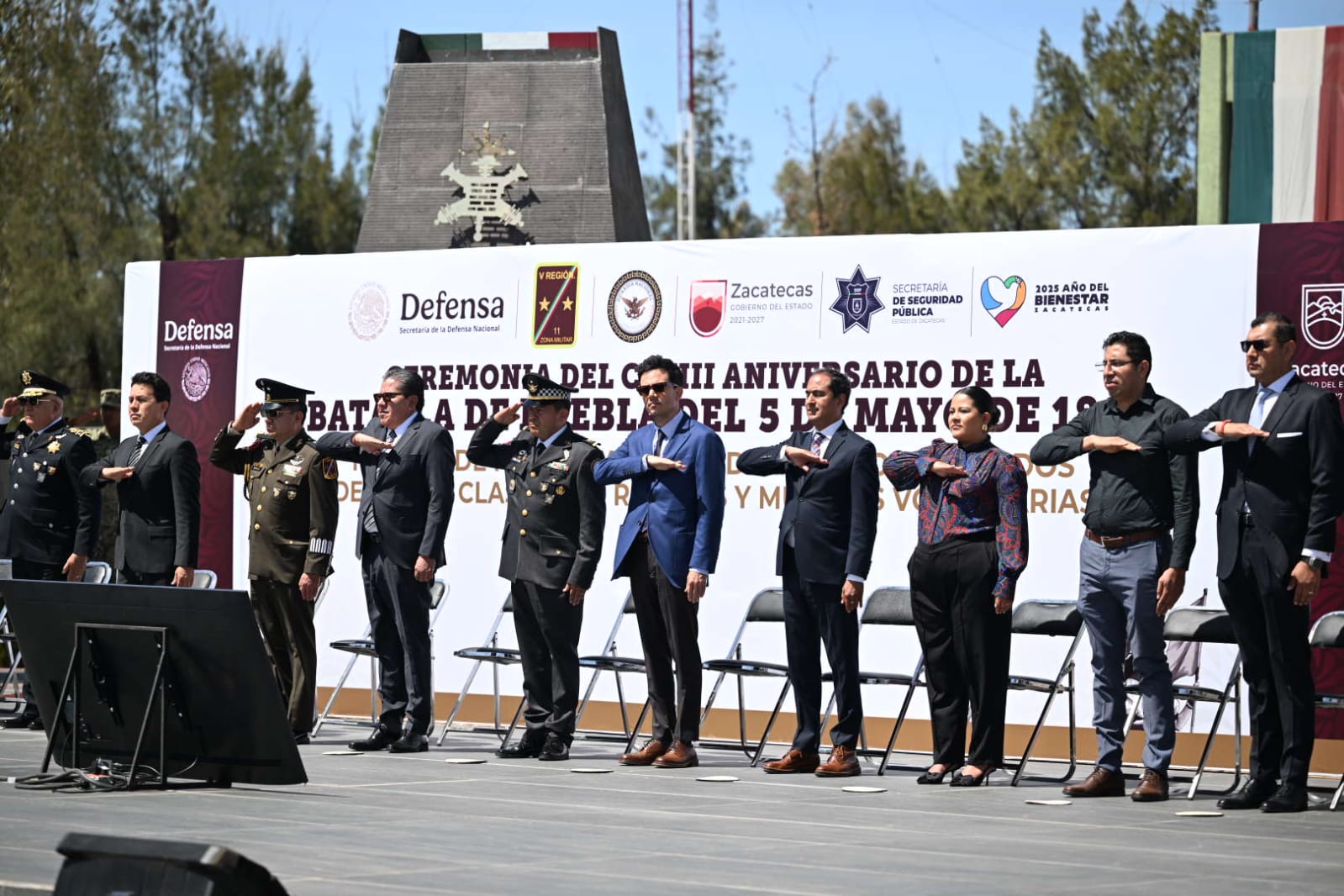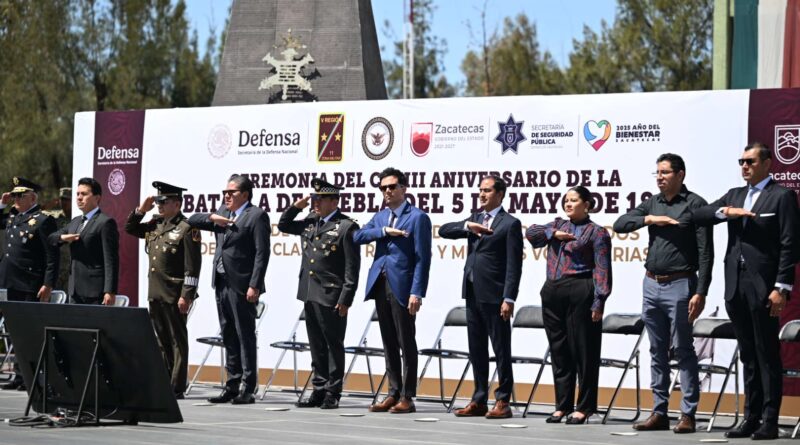 Guadalupe, Zac., 5 de mayo del 2025.- Al encabezar la ceremonia del CLXIII Aniversario de la Batalla de Puebla del 5 de Mayo de 1862 y la toma de protesta de Bandera de los soldados del Servicio Militar Nacional, Clase 2006, remisos y mujeres voluntarias, el Gobernador David Monreal Ávila refrendó su compromiso de seguir consolidando los resultados en la pacificación de Zacatecas, como la reducción de los homicidios dolosos.