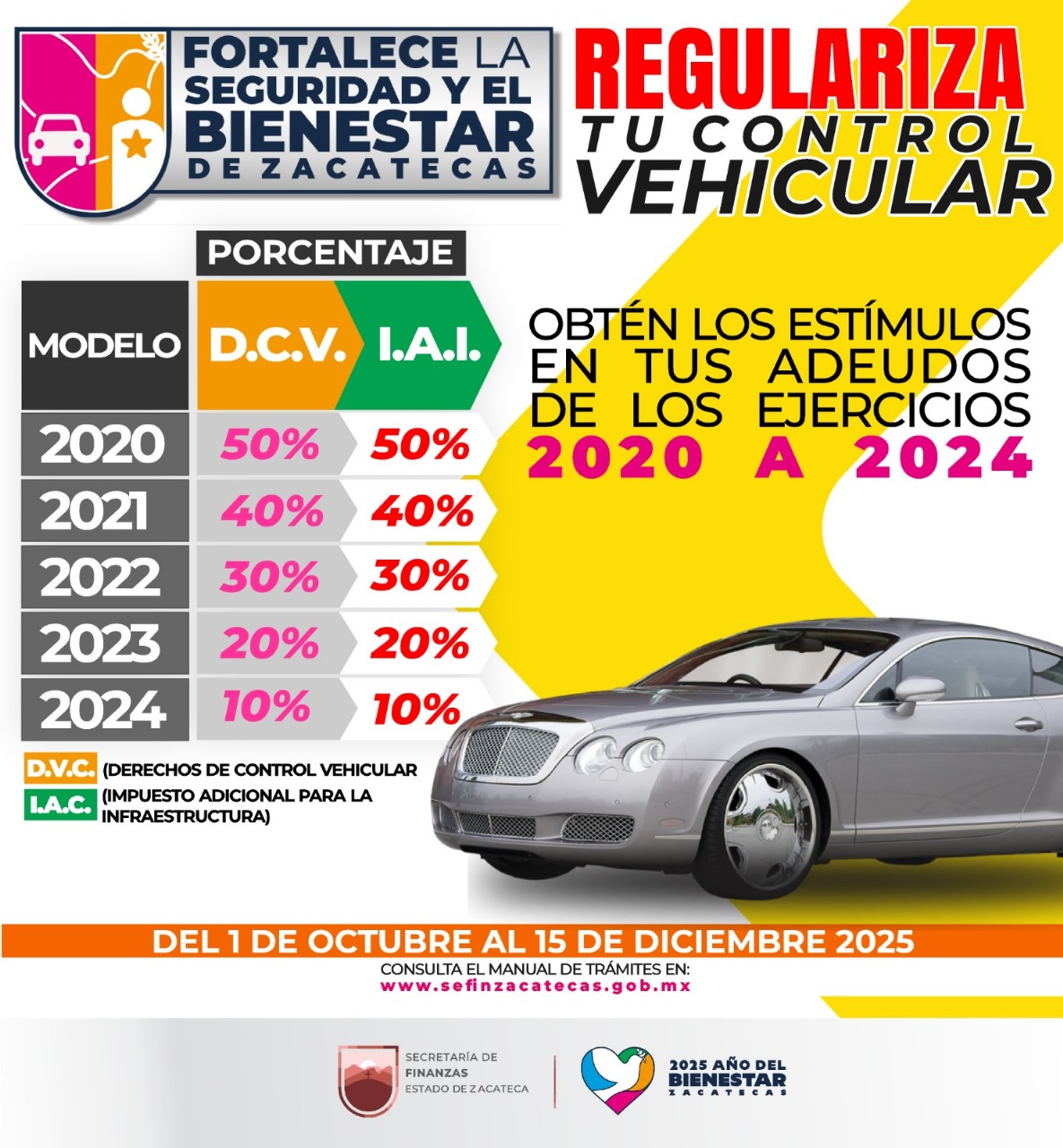Zacatecas, Zac., 11 de diciembre de 2025.- El Gobierno de Zacatecas, encabezado por el mandatario estatal David Monreal Ávila, informa a la ciudadanía que el próximo 15 de diciembre concluye el periodo para acceder a los estímulos fiscales del Programa de Regularización Vehicular para la Seguridad y el Bienestar, implementado a través de la Secretaría de Finanzas, que encabeza Ruth Angélica Contreras Rodríguez.