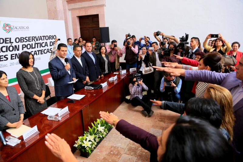 Zacatecas, Zac.- Con la toma de protesta y acompañado por la Presidenta del Instituto Nacional de las Mujeres, Lorena Cruz Sánchez, el Gobernador Miguel Alonso Reyes instaló el Observatorio de Participación Política de las Mujeres en Zacatecas, el décimo en el país.