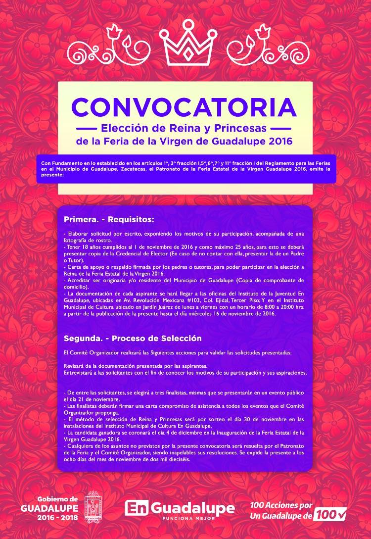 Guadalupe, Zacatecas.- El Patronato de la Feria de Guadalupe, en su edición 2016, emitió la convocatoria para la elección de reina y princesas, de la máxima fiesta de los guadalupenses.