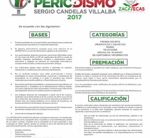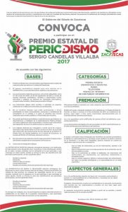 Zacatecas, Zac.- El Gobierno del Estado emitió la convocatoria para el Premio Estatal de Periodismo Sergio Candelas Villalba 2017, con la finalidad de reconocer el trabajo de las y los periodistas en temas que inciden en la vida de los zacatecanos.