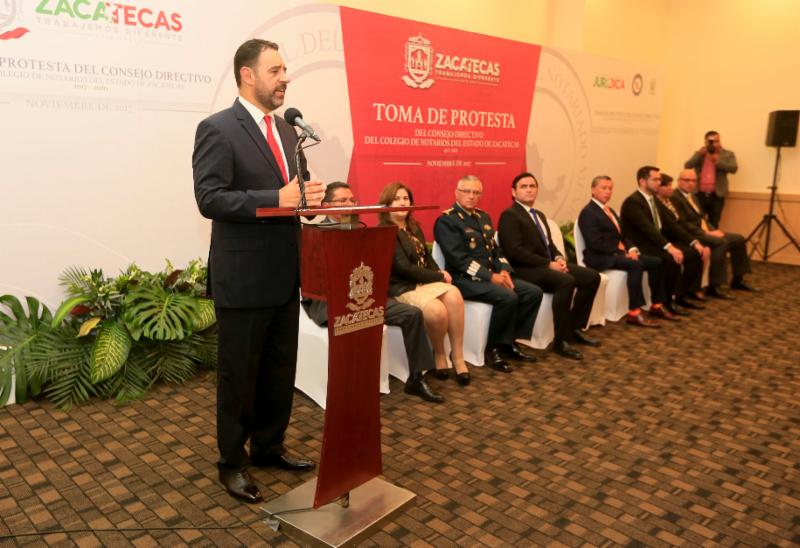 Este miércoles, el mandatario estatal tomó protesta al Consejo Directivo 2017-2020 del Colegio de Notarios del Estado de Zacatecas, cuyo presidente es Luis Fernando Castañeda Ibarra. En el evento, el Gobernador Tello reconoció a los notarios públicos de Zacatecas y les dijo que la administración estatal necesita de su liderazgo, por lo que les refrendó su compromiso de trasparencia y equidad en todo proceso.