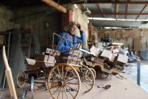 Y en un mundo de piezas de su alrededor, saca una vieja imagen y nos comparte uno de sus objetivos anhelados: construir un viejo modelo de diligencia, pero decorada en oro y plata.