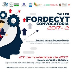 Por ello, el Consejo Zacatecano de Ciencia, Tecnología e Innovación (Cozcyt) impartirá el taller FORDECYT Convocatoria 2017-2, con el propósito de capacitar a integrantes de empresas e instituciones educativas interesados en participar en la convocatoria y obtener los recursos federales.