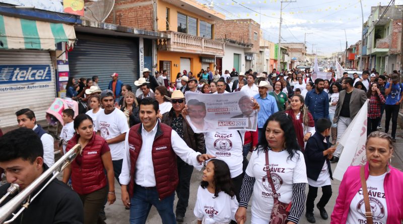 Julio César Chávez, abanderado de la coalición “Juntos Haremos Historia” para la presidencia de Guadalupe. Miles de personas se congregaron en Tacoaleche para acompañar a Julio César Chávez, cuando la lluvia dio tregua para celebrar una callejoneada con motivo del Día del Padre, donde además, los habitantes bailaron al son de la tambora.