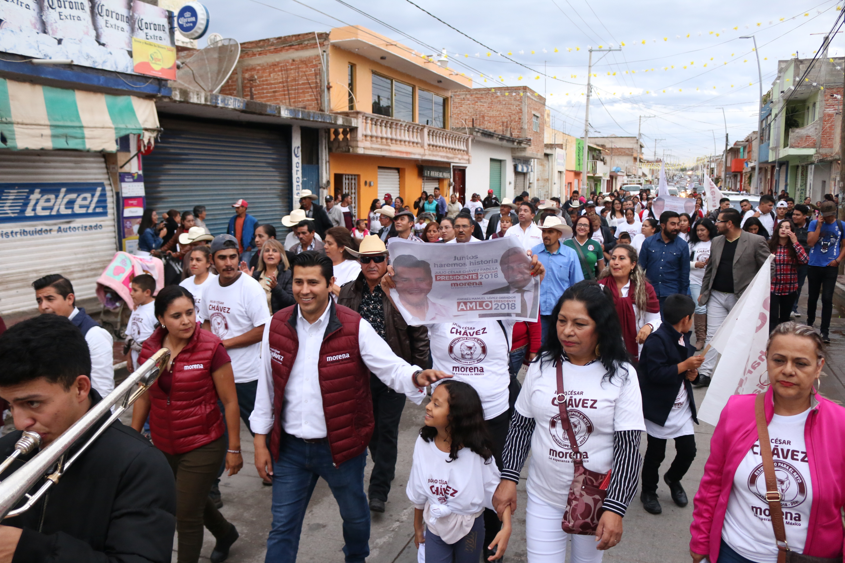 Al pasar por las calles principales, la gente salía de sus negocios y apoyaba con mensajes como “¡Julio Presidente!”, pues están convencidos de que el Proyecto de Nación es el ideal que llevará por buen camino el futuro de México y de Guadalupe. La callejoneada terminó a las afueras del Templo del Refugio, donde los guadalupenses bailaron con Julio César Chávez y con Alma Dávila, candidata a Diputada local por el distrito IV, ambos, abanderados de MORENA.