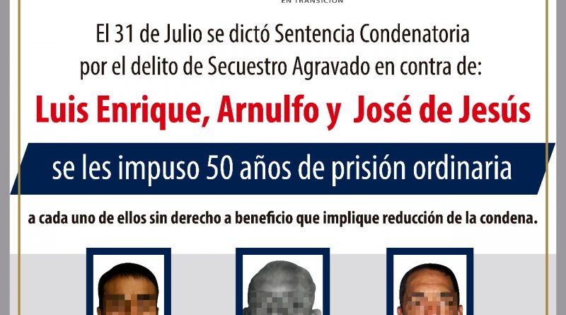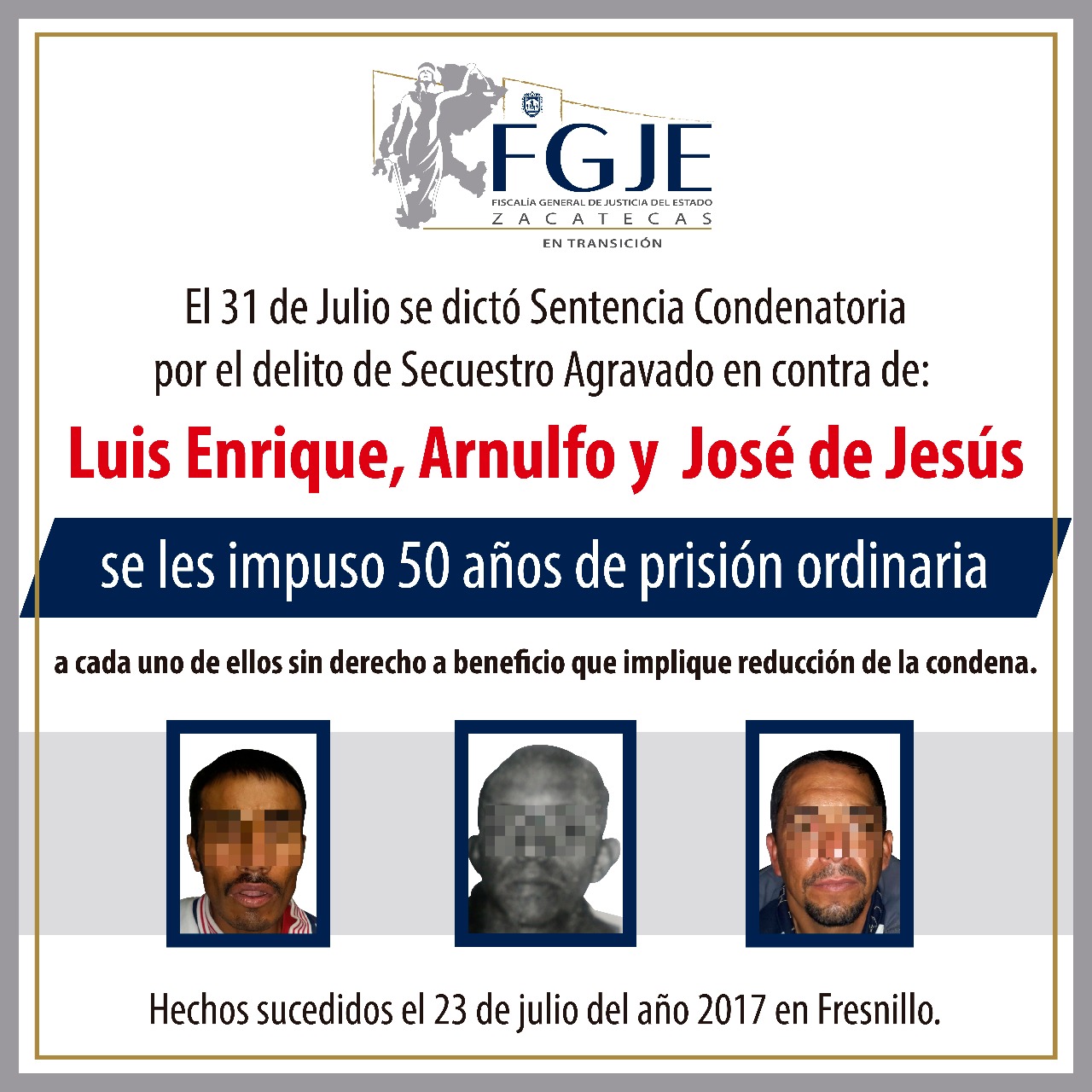 El día 31 de julio se logró una sentencia condenatoria por el delito de secuestro agravado en contra de Luis Enrique “N”, Arnulfo “N”, y José de Jesús “N”, por 50 años de prisión para cada uno, sin derecho a beneficio a que se les reduzca su condena, hechos sucedidos el 23 de julio del 2017 en el municipio de Fresnillo.