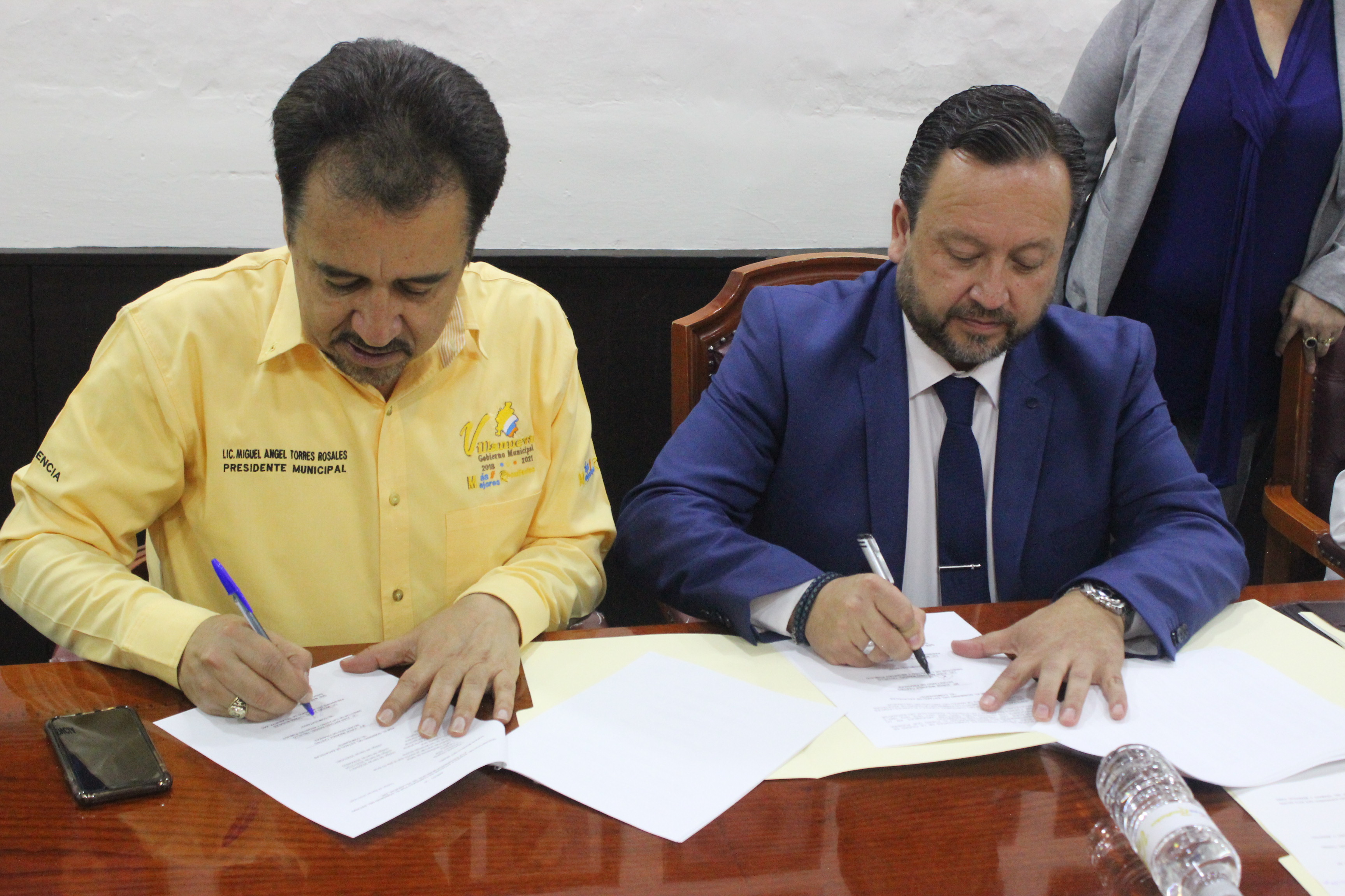 Durante la firma estuvieron presentes, la Síndico Municipal Ma. Guadalupe Salas, la Tesorera Municipal Daniela Corvera, Francisca Palacios Directora de Catastro, Gustavo Bajaras Director de Obras Publicas y compañeros de medios de Comunicación.