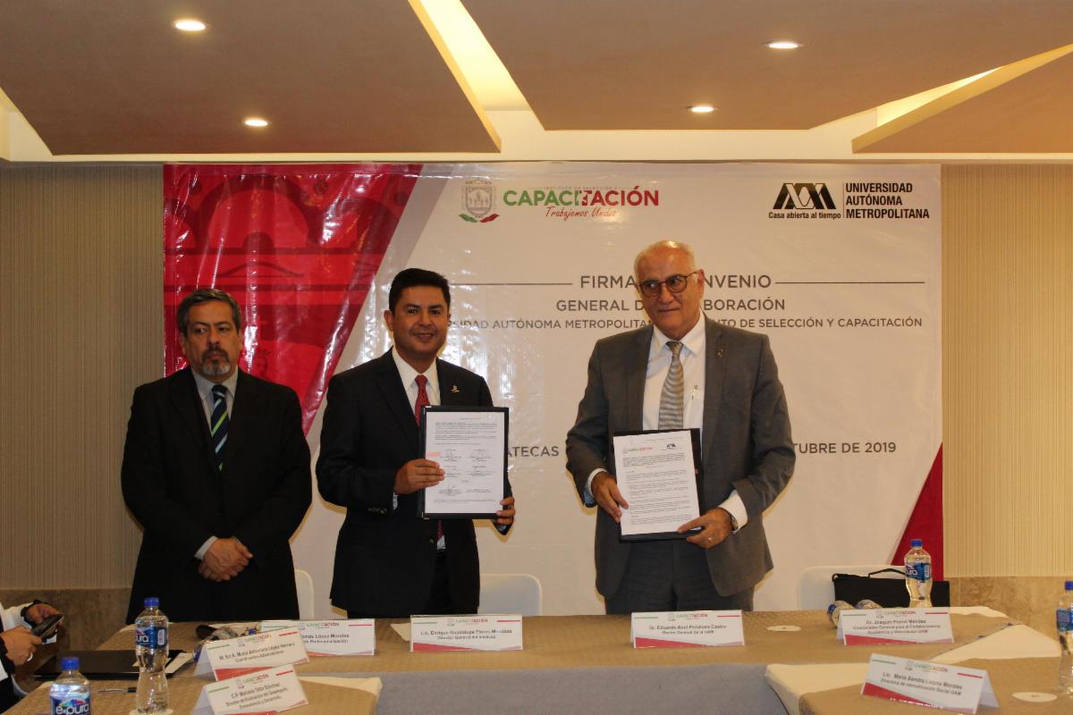 Zacatecas, Zac.- Para fortalecer la profesionalización de las y los servidores públicos del Gobierno del Estado, para que brinden atención de calidad a la ciudadanía, el Instituto de Selección y Capacitación (Inselcap) y la Universidad Autónoma Metropolitana (UAM) firmaron un convenio de colaboración.