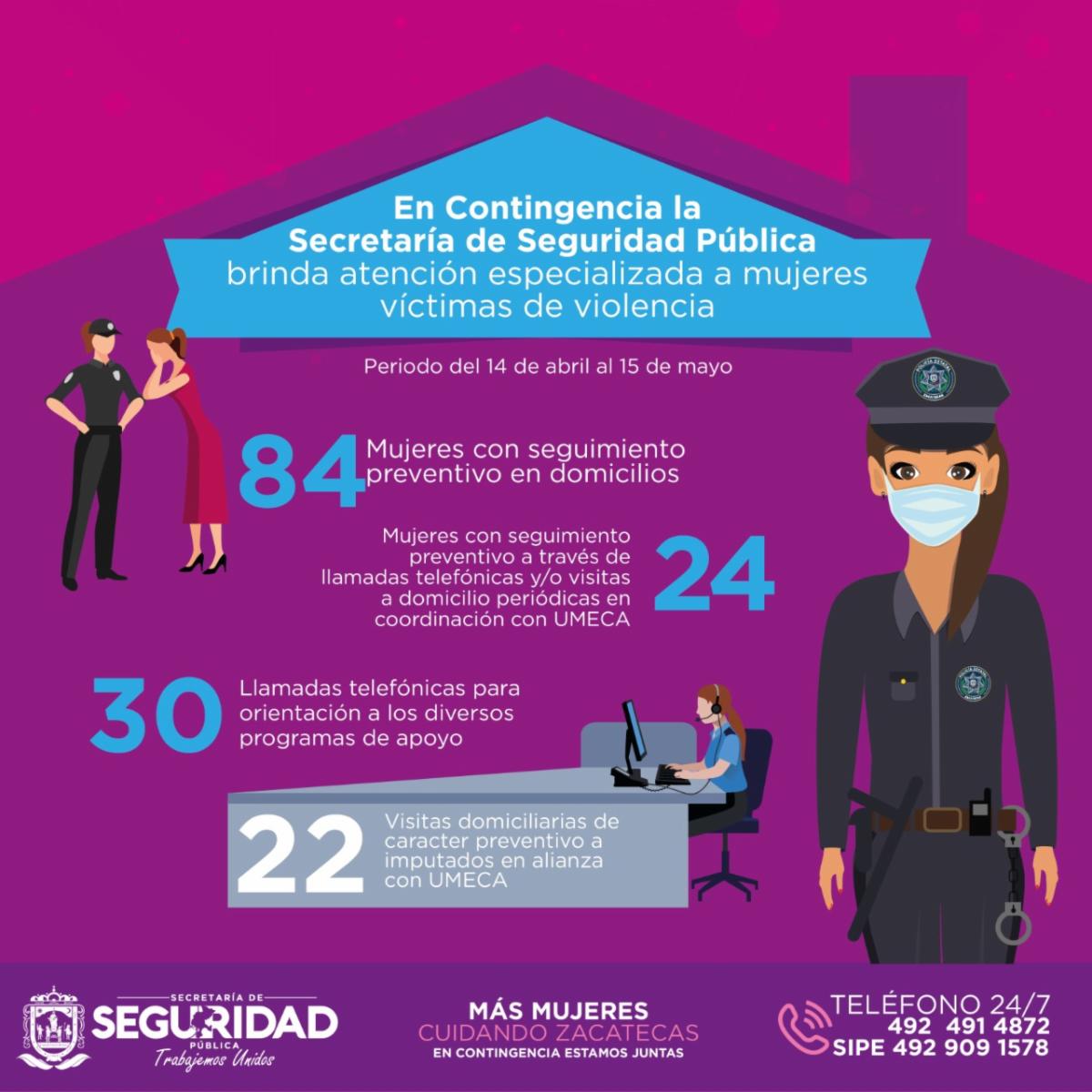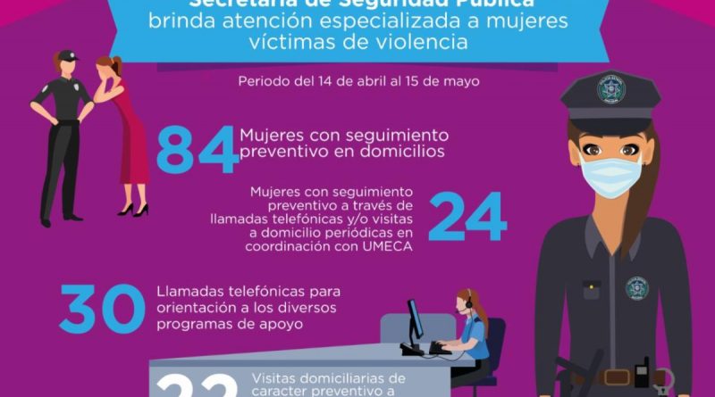 La Secretaría de Seguridad Pública trabaja en coordinación con otras áreas del Gobierno del Estado en el programa En Contingencia Estamos Juntas, lo que ha permitido que la unidad especializada atendiera directamente a 74 mujeres en sus domicilios, del 14 de abril al 15 de Mayo, producto de reportes a través del Sistema de Emergencia 911.