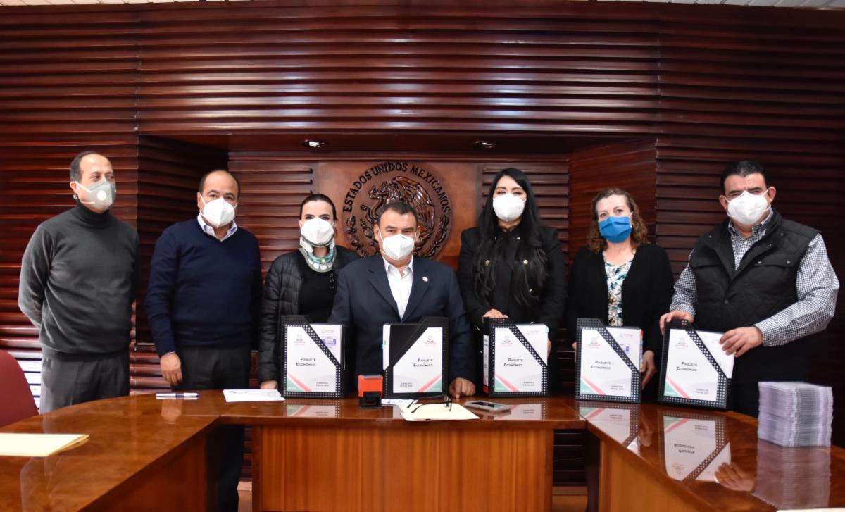 El documento que contiene las iniciativas que conforman el Paquete Económico para el Ejercicio Fiscal 2021 fue recibido por Le Roy Barragán Ocampo, secretario general de la LXIII Legislatura; Pedro Martínez Flores, presidente de la Comisión de Régimen Interno y Concertación Política; los coordinadores de las fracciones parlamentarias: José María González Nava, Aida Ruiz Flores Delgadillo, Susana Rodríguez Márquez y Jesús Padilla Estrada Padilla; así como por Carolina Dávila Ramírez, presidenta de la Mesa Directiva.