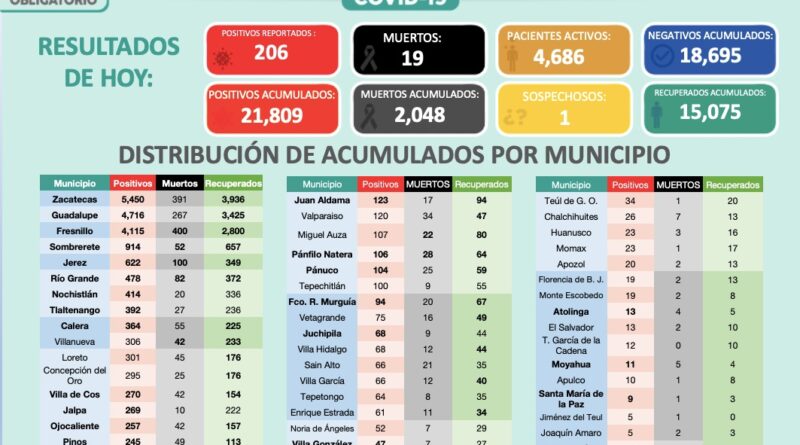 Zacatecas, Zac., 7 de enero de 2021.- Este jueves, la Secretaría de Salud de Zacatecas (SSZ) reportó 206 nuevos casos confirmados de Coronavirus (COVID-19), con lo cual, el acumulado es de 21 mil 809 casos en todo el estado, en lo que va de la pandemia.