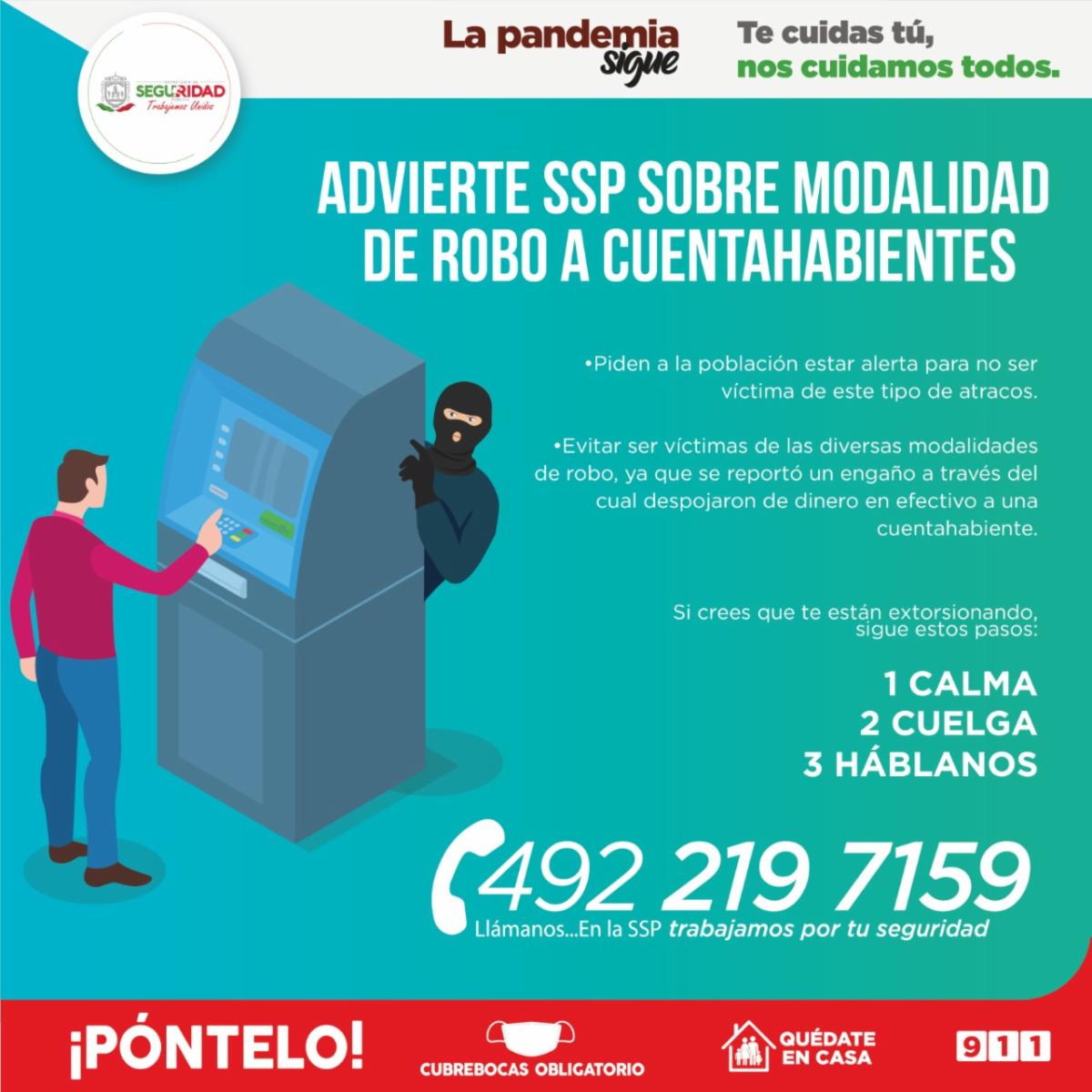 Zacatecas, Zac.- La Secretaría de Seguridad Pública (SSP) solicita a la población zacatecana mantenerse alerta y evitar ser víctimas de las diversas modalidades de robo, ya que se reportó un engaño a través del cual despojaron de dinero en efectivo a una cuentahabiente.