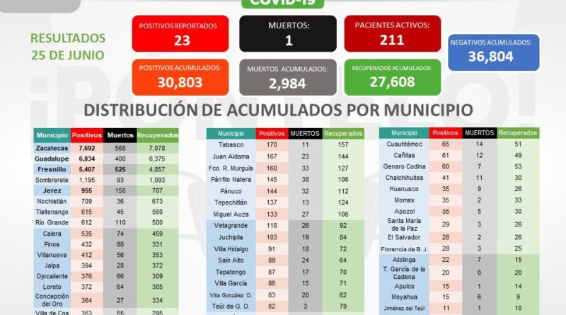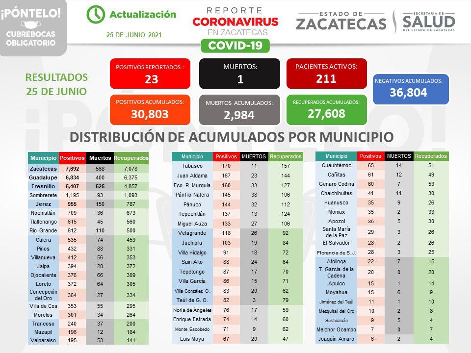 Zacatecas, Zac., 25 junio 2021- Este viernes, la Secretaría de Salud de Zacatecas (SSZ) registró un deceso y 23 nuevos contagios de COVID-19; en tanto, no hubo personas recuperadas.
