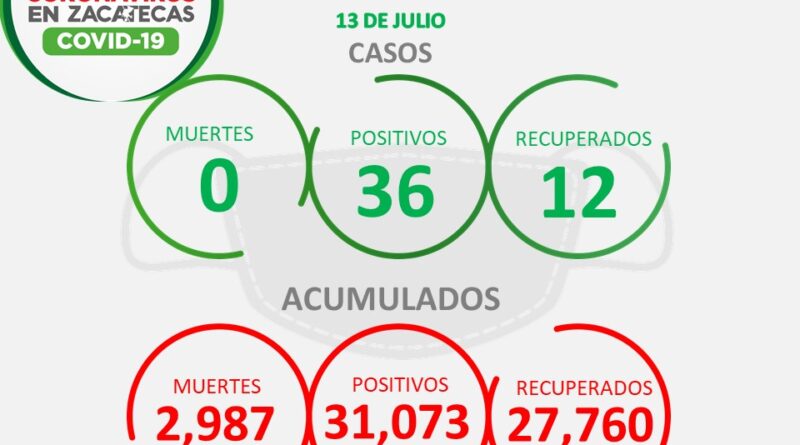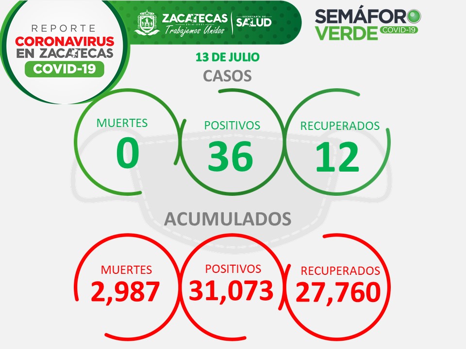 Zacatecas, Zac., 13 de julio de 2021.- Nuevamente, este martes, la Secretaría de Salud de Zacatecas (SSZ) no reporta muertes por COVID-19. Este día son 36 nuevos casos positivos y 12 personas las recuperadas de la enfermedad.