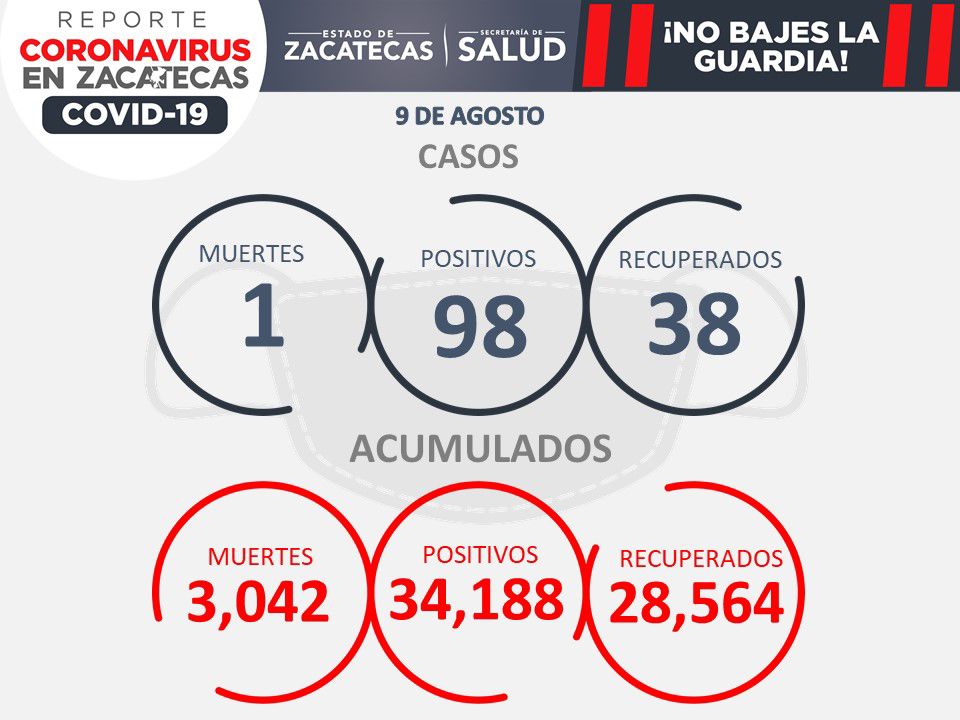 Zacatecas, Zac., 09 de agosto de 2021.- Este lunes, la Secretaría de Salud de Zacatecas (SSZ) registró un fallecimiento y 98 nuevos contagios de COVID-19, así como 38 pacientes recuperados.
