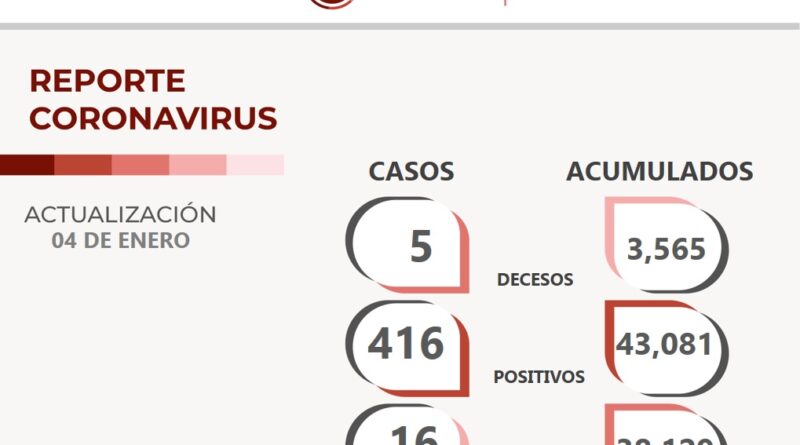Con los cinco fallecimientos reportados hoy, suman en total 3 mil 565 en la entidad. Corresponden a una zacatecana de 78 años, quien padecía hipertensión.