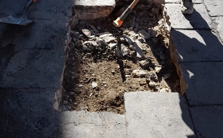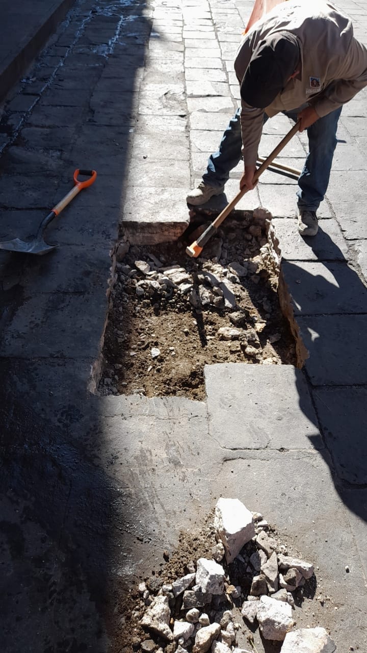 Bacheo con adoquín irregular en la colonia Tres Cruces, calle Canteros
