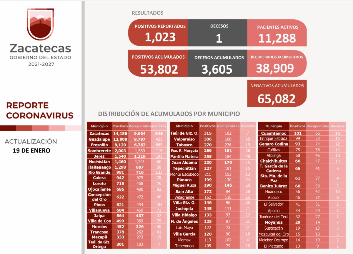 Zacatecas, Zac., 19 de enero de 2022.- La Secretaría de Salud de Zacatecas (SSZ) informó que, para este miércoles, se recuperaron en el estado 121 pacientes de Covid-19, falleció una persona y hay 1 mil 23 nuevos positivos.