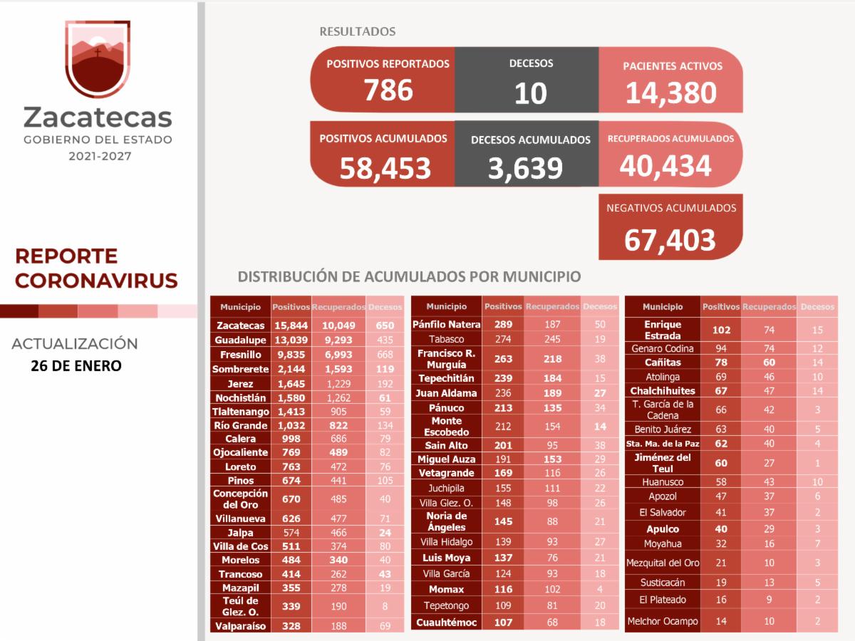 Zacatecas, Zac., 26 de enero de 2022.- La Secretaría de Salud de Zacatecas (SSZ) informó que en las últimas 24 horas se contabilizaron 786 contagios, 288 personas recuperadas del COVID-19 y 10 fallecimientos como consecuencia del coronavirus. En total, son 40 mil 434 recuperados y 58 mil 453 casos positivos, hasta este día.