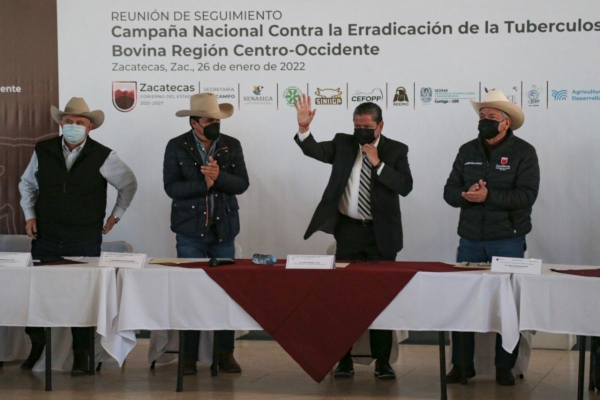 Al encabezar los trabajos de la Campaña Nacional contra la Erradicación de la Tuberculosos Bovina, región centro-occidente, a la cual acudieron autoridades de San Luis Potosí, Aguascalientes y Jalisco, así como la familia ganadera de Zacatecas y de los tres estados invitados, el mandatario informó que ha pedido a la Secretaría del Campo que la nueva gobernanza se ponga al servicio de una estrategia regional para lograr una certificación sanitaria que permita mayor competitividad.