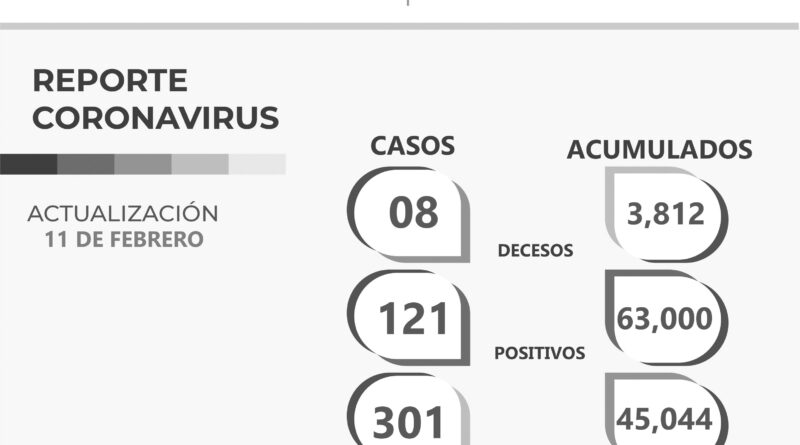 Zacatecas, Zac,. 11 de febrero de 2022.- La entidad reporta, en total, 45 mil 044 personas recuperadas de COVID-19, con las 301 de este día; así como 63 mil contagios confirmados, con los 121 contabilizados hoy, y 3 mil 812 personas fallecidas en lo que va de la pandemia, al sumar los últimos ocho decesos.