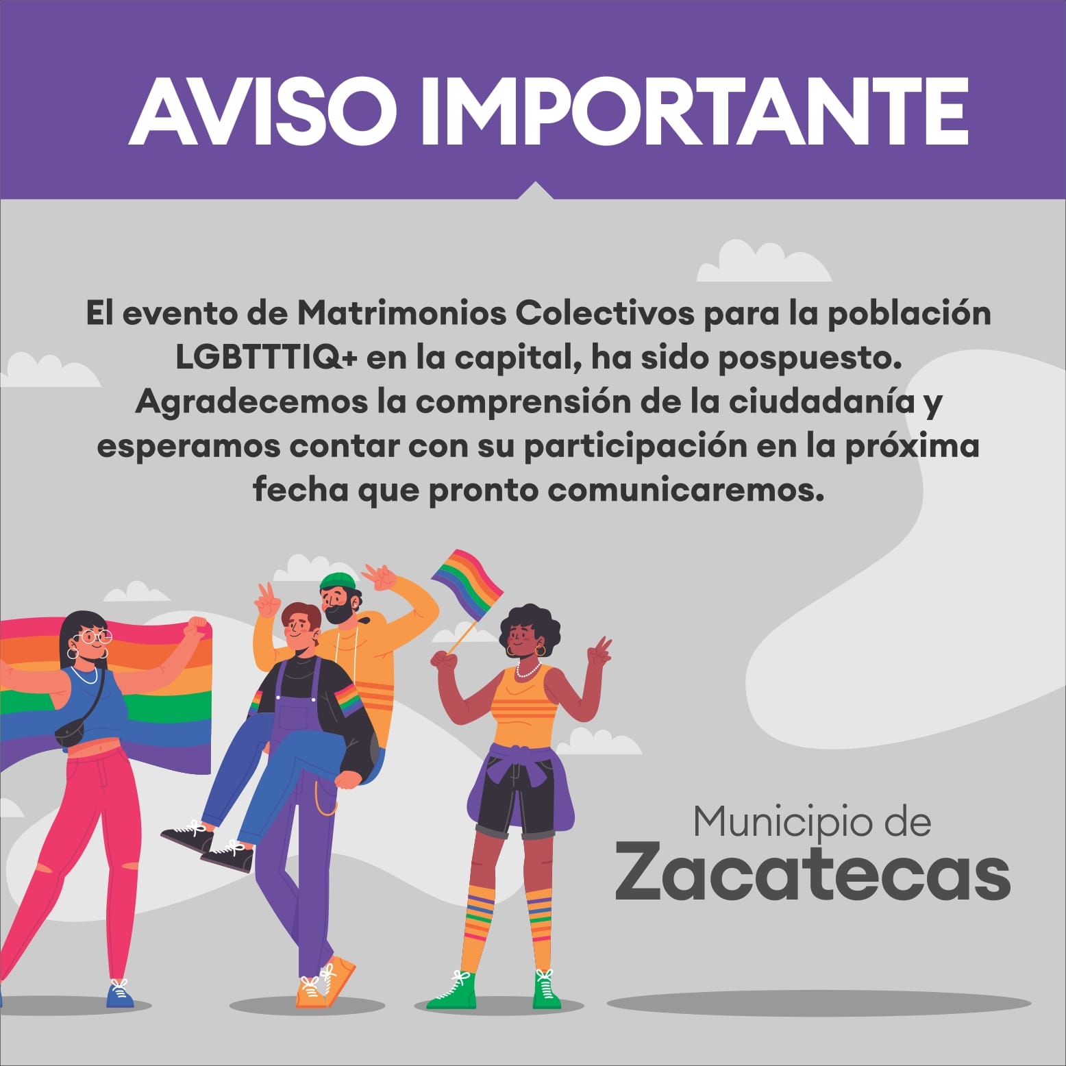 La ceremonia de matrimonios colectivos que se realizaría este 14 de febrero por parte del Municipio de Zacatecas, se aplazará hasta mayo con el fin de privilegiar la salud de las y los zacatecanos interesados en contraer nupcias.