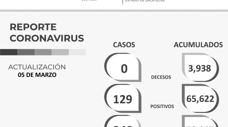 Zacatecas, Zac., 5 de marzo de 2022.- Este sábado, por segundo día consecutivo, la Secretaría de Salud de Zacatecas no reportó defunciones asociadas al COVID-19. Informó de 343 personas declaradas libres del coronavirus y a 129 que se sumaron a la lista de quienes resultaron contagiadas.