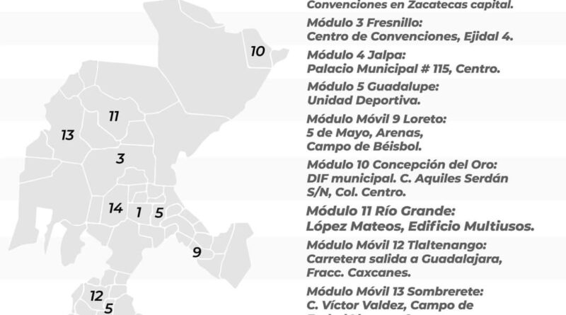 Dichos módulos estarán ubicados en los siguientes municipios en un horario de atención de lunes a sábado de 9:00 a 17:00 horas: Zacatecas, Macromódulo Estacionamiento del Palacio de Convenciones de Zacatecas; Guadalupe, Unidad Deportiva de Guadalupe; Fresnillo, Centro de Convenciones, Ejidal 4, Fresnillo, Zacatecas.