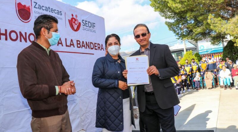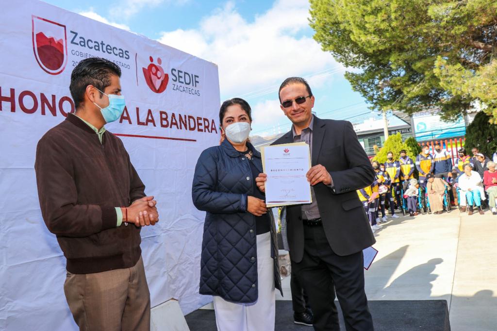 Zacatecas, Zac., 27 de junio de 2022.- La Casa Hogar de la Tercera Edad celebró su 36 Aniversario y, durante la ceremonia de Honores a la Bandera, se realizó una conmemoración especial donde la Presidenta Honorífica del Sistema Estatal para el Desarrollo Integral de la Familia (SEDIF), Sara Hernández de Monreal, entregó reconocimientos a las Unidades Académicas de Enfermería y de Cultura Física y Deporte, por el gran apoyo que han otorgado a esta institución.